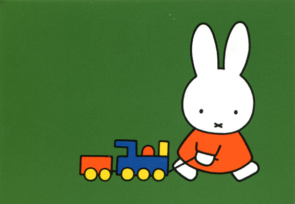 Nijntje met een treintje. Ansichtkaart. Zie ook Trijntje. |