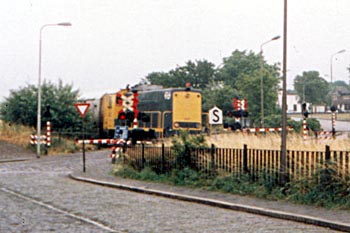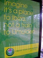 Spoorwegovergang Julianakade, omstreeks 1985. De bovenleiding is verdwenen en de rangeerder moet de AHOB met een sleutel bedienen. Foto Herman Mooij. Tweede foto: Baarn, 30 maart 2005. Het bewijs dat reclamemakers nooit in een trein zitten. IJmuiden is al tientallen jaren niet meer in de dienstregeling opgenomen. |