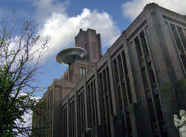 Utrecht, 10 mei 2007. Hgb III, bijgenaamd De Inktpot. De vliegende schotel dateert van een kunstproject uit 1999. De andere objecten die met dat project (Panorama 2000) te maken hadden zijn uit de stad verdwenen. |