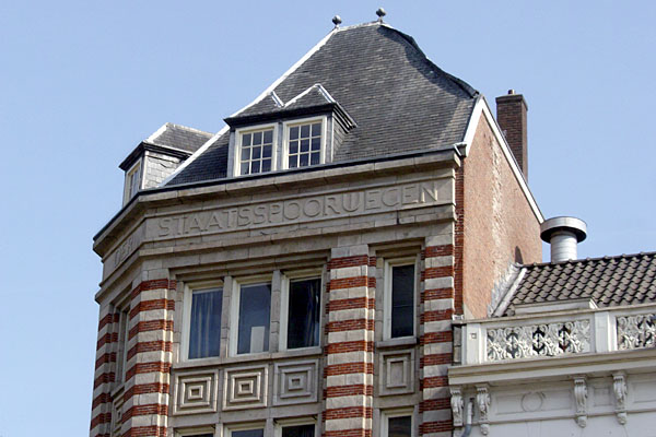 Amsterdam, 21 april 2008. Reisbureau der Staatsspoorwegen op de Dam. Geen station, want Amsterdam behoorde tot het domein van de HIJSM, maar de SS probeerde wel reislustig publiek te trekken. Zie Google Maps. |