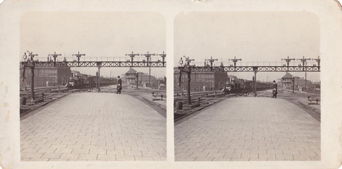 Amsterdam CS, 3 april 1910. Willem Derens met zijn zoontje Gerrit. Stereofoto gemaakt door zijn broer Lodewijk Derens. Links het hoofdgebouw van de HSM: de Droogbak. Collectie Joris Dijkstra. Lees meer over fotograaf Derens. |