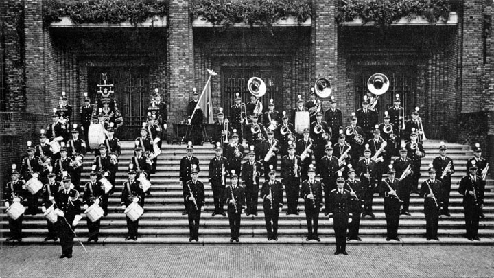 Utrecht, jaren zestig. Het NS Harmonieorkest poseert op de trappen van Hgb III. Links staat de drumband met vooraan de tambour-maître. Rechts het harmonieorkest, met op de voorgrond de dirigent: M. Bontrop. Die heb ik goed gekend, want hij dirigeerde ook het orkest waar ik zelf in speelde: Oefening Kweekt Kennis uit Hilversum. |