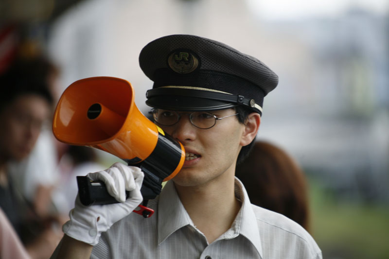 De plaatselijke omroepinstallatie. Volgens mij riep hij geen reisinformatie om, maar meer in welk deel