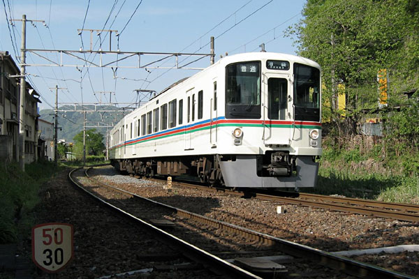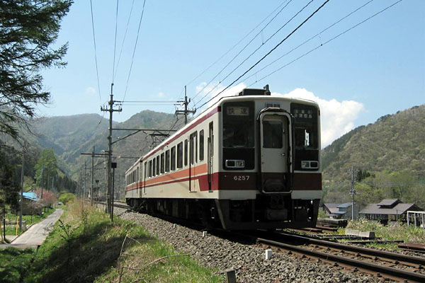 Nabij Shiobara rijdt hier een elektrisch tweetje van de Tobu-Kinugawa-lijn, 6 mei 2004. Foto Peter van Vonderen. |
