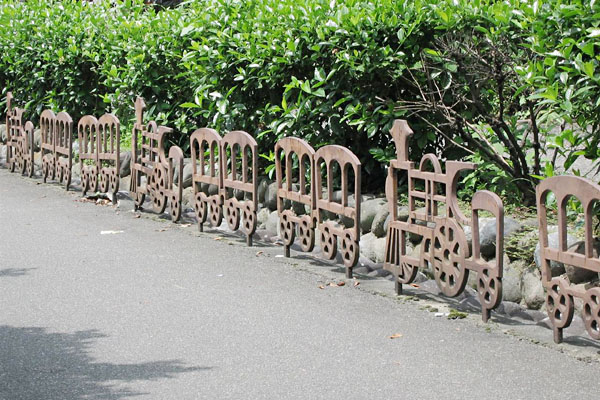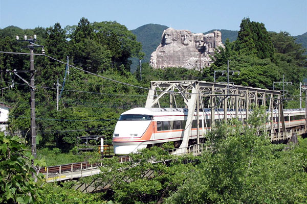 Ook op de Tobu-Kinugawa-lijn, hier nabij het Western Park in Kinugawa, rijden snel uitziende treinen van en naar Asakusa in Tokyo, 4 juni 2004. Let op de beeldengroep in de achtergrond! Foto Peter van Vonderen. |