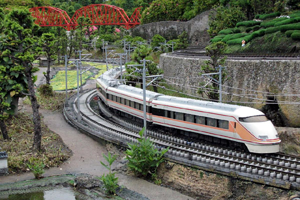 In Kinugawa zelf rijden snel uitziende kleine treinen door het Tobu World Square. Dit park (schaal 1 op 25) mag je niet missen als je Japan bezoekt, net als Nikko dat er vlak bij ligt. 12 juni 2004. Foto Peter van Vonderen. |