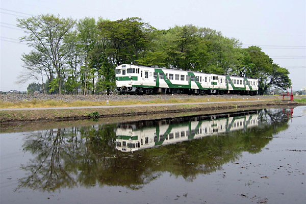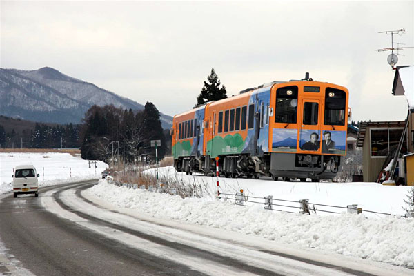Een dieseltweewagenstel met decoraties die te maken hebben met het nieuwe 1000 yen-bankbiljet. Aizu Line, 6 januari 2005. Foto Peter van Vonderen. |