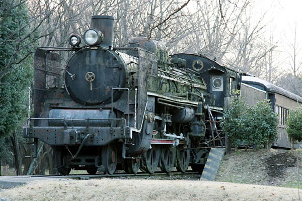 Japan heeft ontzettend veel statisch opgesteld spoorwegmaterieel. Overal in het landschap kom je oude goederenwagens tegen, die worden gebruikt om er dingen in te bewaren. Hier en daar staan stoomlocomotieven. De mooiste staat hier in Koganei, in het park nabij het openluchtmuseum. In dat museum zelf staat een oude tram. 30 januari 2005. Foto Peter van Vonderen. |