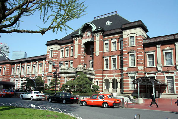 Men is van plan om de ontbrekende bovenste verdieping van Tokyo Station er ooit weer eens bovenop te zetten. Sinds de tweede wereldoorlog is het oude stationsgebouw voorzien van een geimproviseerd dak. 14 april 2005. Foto Peter van Vonderen. |