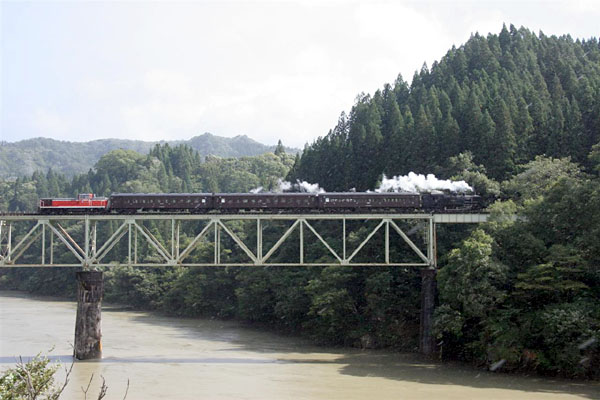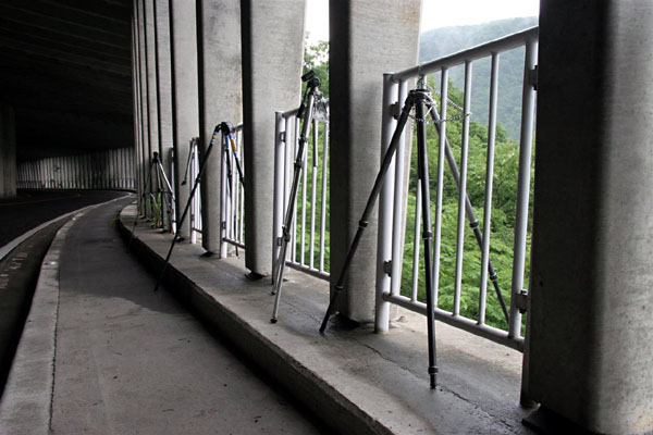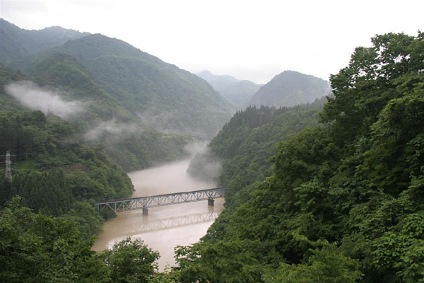 In de Aizu regio vindt men de Tadami-lijn. Op deze spoorlijn, met veel fraaie mysterieuze bruggen, rijden per dag wel drie treinen in elke richting. Enkele keren per jaar kan men er een stoomtrein tegenkomen. Op 1 juli 2006 reden er helemaal geen treinen, vanwege de regen. Als je er een trein wilt fotograferen moet je wel even je statief enkele dagen van tevoren aan het hek ketenen! Foto's Peter van Vonderen. |