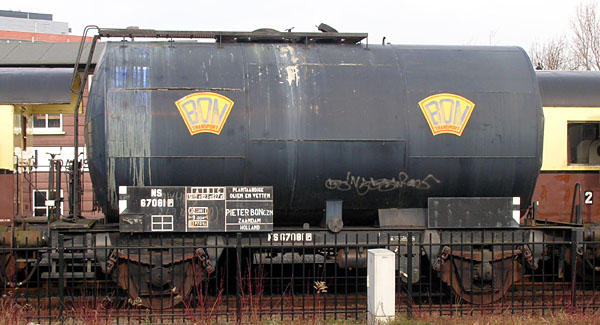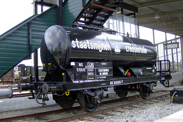Spoorwegmuseum, 25 augustus 2008. Ketelwagen 515615 P (oorspronkelijk 10402). In 1919 gebouwd door Wagonfabrik Uerdingen, Uerdingen. Max. snelheid 80 km/uur. De letter P betekent dat het een particuliere wagen is, in dit geval van de Staatsmijnen. Aanvankelijk werden deze wagens gebruikt voor intern transport, later kregen ze een toelating voor het hoofdnet van NS. De ketelwagens werden gebruikt voor het transport van creosootolie. Creosoot werd gebruikt voor het impregneren van houten dwarsliggers. |