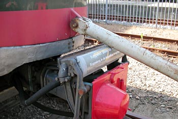 Spoorwegmuseum, 5 september 2003. Treinstel 273 bevindt zich niet onder de bovenleiding, en kan dus alleen met behulp van een dieselloc of locomotor worden verplaatst. Als er geen koppelwagen beschikbaar is, zoals in het museum, dan gebeurt dat door middel van een koppelboom. |