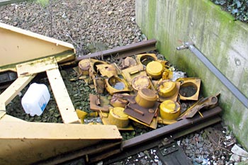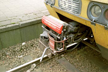 Venlo, 30 april 2004. Na het ontkoppelen van twee treinstellen plan V is een van de koppelingen blijven hangen. Na een ruk aan de ontkoppelkabel gaat het koppeloog alsnog naar binnen en draait de afdekplaat naar beneden. |