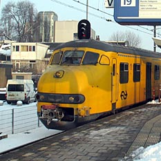 Amersfoort, 6 februari 2005. Een ongebruikelijke combinatie: Hondekop 766 met Blauwe Engel 41. Foto's Dennis Revier. Deze materieelsoorten kunnen gekoppeld rijden, maar alleen mechanisch. De elektrische koppeling werkt niet. Het is dus niet mogelijk om vanuit de Hondekop de Blauwe Engel te bedienen; die loopt in opzending mee. Meer over gemengde koppelingen verderop. |
