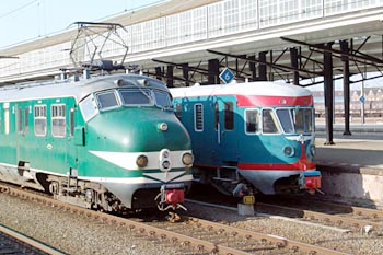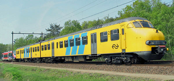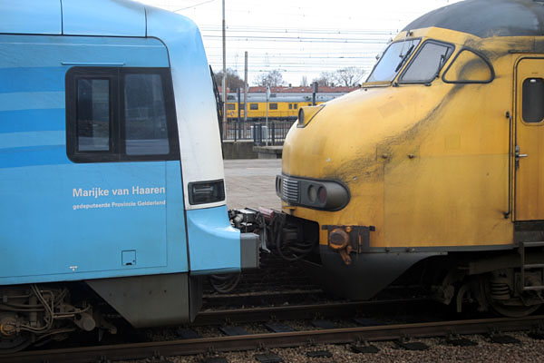 Treinstel 766 gekoppeld met motorrijtuig 41 (Amersfoort, 23 april 2005) en met treinstel 252 (foto Dennis Revier, Alkmaar, 10 april 2005). De elektrische contacten zijn niet doorverbonden. Bij de 41 is dit niet toegestaan omdat dit een dieseltrein is, en bij de 252 niet omdat dat treinstel geen elektrische installatie meer bezit. Bij de dieseltreinen zijn de beschermkappen van de contactdozen blauw geschilderd, ter onderscheiding van de rode contactdozen van het elektrische materieel. |