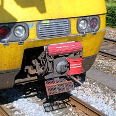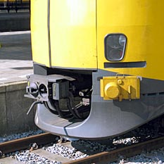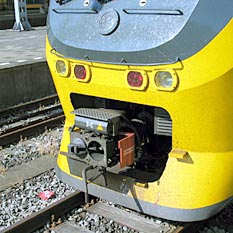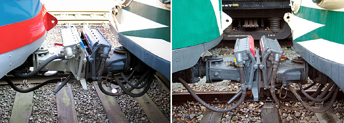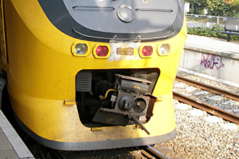 Breukelen, 22 juli 2003. De dubbeldekstreinen van de eerste generatie, die door locs serie 1600/1800 worden geduwd of getrokken, hebben buffers en schroefkoppelingen. De tweede generatie heeft aan de uiteinden bovendien een laag geplaatste automatische koppeling (BSI-koppeling). Hiermee kunnen de locs (serie 1700), de motorrijtuigen en de stuurstandrijtuigen met elkaar worden gekoppeld. Tweede foto: Utrecht, 5 Mei Plein, 1 juni 2004. De sneltrams Utrecht-Nieuwegein hebben eenzelfde soort koppeling. (Bij deze botsing zijn geen slachtoffers gevallen.) |