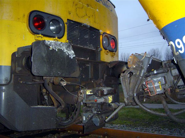Hoofddorp opstelterrein (Hfdo), 27 november 2010. Onbedoelde en onzachte ontmoeting tussen een BSI-koppeling (links) en een Schaku. Duidelijk is te zien dat deze niet op elkaar passen. Foto Bas van Heezik. |
