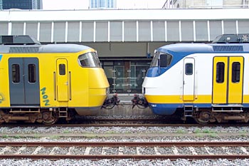 Rotterdam Centraal, 5 mei 2005. Aanvankelijk was het koppelen van oude en gerenoveerde Sprinters niet toegestaan, omdat de oude exemplaren het remsysteem van de nieuwe zouden kunnen vervuilen met olie. Maar in de praktijk gebeurde het natuurlijk soms wel. Foto's Dennis Revier. |