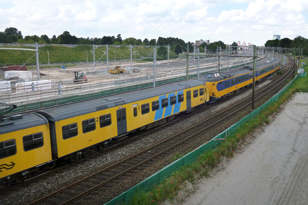 Bunnik, 7 juni 2018. Treinstel 8657 sleept ICE-stel 4611 naar de Watergraafsmeer. De ICE uit Duitsland had die ochtend even voor Arnhem de moed opgegeven. Al na twee uur (dit is voor NS-begrippen echt snel) werden de passagiers geëvacueerd met een Sprinter die ze naar Arnhem bracht. Naar verluidt is het al het derde ICE-stel dat in de afgelopen twee weken onderweg defect is geraakt. Dit materieel staat er niet om bekend dat het goed tegen warm weer kan. Bekijk het filmpje. |