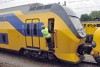 Utrecht, 12 mei 2004 en Arnhem, 31 augustus 2004. De boegdeuren zijn van belang vanwege de luchtweerstand, en beschermen daarbij de koppeling. Als een machinist ze vergeet te sluiten, moeten ze bij een snelheid van 30 km/uur automatisch dichtgaan. Maar dat gebeurt dus niet altijd. |