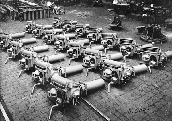 Een voorraad Scharfenbergkoppelingen. De foto komt uit een Werkspoor-archief maar is waarschijnlijk gemaakt bij de fabrikant in Duitsland. De fabrieksplaatjes zijn op de foto witgelakt. |