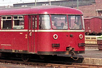 Düren, 11 augustus 1970. De eerste railbussen hadden een kleine Scharfenbergkoppeling. De volgende generatie kreeg buffers en schroefkoppelingen. Rechterfoto: Utrecht, 3 april 2001. Scharfenbergkoppeling van een Lint. |