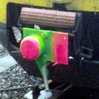 Amsterdam, 13 november 2007. De metrostellen zijn voorzien van Scharfenbergkoppelingen. Bovenop is een schijfje te zien met een streep erop. Dat schijfje is verbonden met de koppelschijf in de koppeling, en dient om te controleren of beide koppelschijven helemaal in de eindstand zijn gedraaid tijdens het koppelen. Diagonaal: de koppelschijf is niet meegedraaid en de koppeling is dus maar half (of helemaal niet) tot stand gekomen. In lengterichting: de schijven hebben zich goed in elkaar vastgegrepen. Op deze foto is te zien dat dit niet altijd goed wordt gecontroleerd door de metrobestuurders van het GVB. Foto en toelichting André Bergema. |