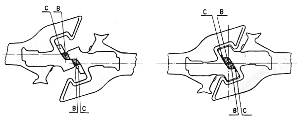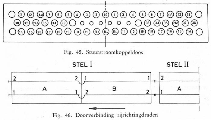 Een bezoeker van mijn site zond mij dit schema uit "Elektrische en Dieselelektrische Tractie", een handleiding uit circa 1964. Een onderdeel van de Scharfenbergkoppeling is de koppeldoos. Hierin zitten koperen pennen die voor de elektrische verbindingen zorgen wanneer twee treinstellen met elkaar gekoppeld zijn. In fig. 45 is te zien dat de meeste contacten dubbel zijn uitgevoerd; ze liggen symmetrisch ten opzichte van het midden van de koppeldoos. Bij elke stand van de treinstellen ten opzichte van elkaar worden zo de juiste verbindingen gemaakt. Uitzondering hierop zijn de contacten die met 1 en 2 zijn genummerd; deze zijn enkel uitgevoerd. Deze contacten hebben te maken met de rijrichting van de trein: draad 1 is "vooruit", draad 2 is "achteruit". Om dit te verklaren bekijken we fig. 46. Treinstel I bestaat uit twee rijtuigen A en B, elk met een motorinstallatie. Bij de getekende rijrichting wordt draad 1 bekrachtigd en staat de rijrichtingwals van A in de stand "vooruit". De installatie van B werkt echter achteruit, zodat hier de met 2 genummerde draad onder spanning moet staan. Draad 1 van rijtuig A moet daarom verbonden zijn met draad 2 van B. In rijtuig A van treinstel II moet de installatie weer in de stand "vooruit" werken, dus moet in de koppeldozen tussen beide stellen contact 2 van stel I verbinding maken met contact 1 van stel II. |