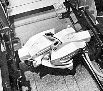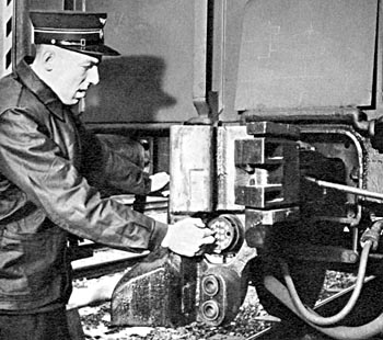 Spoorwegmuseum, 9 juni 1973. Opengeklapte Scharfenbergkoppeling van treinstel 27. Duidelijk te zien zijn de koperen contacten die voor de elektrische verbindingen zorgen. |