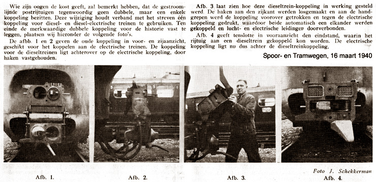 Uit "Spoor- en Tramwegen", 16 maart 1940. Dubbele, opklapbare koppeling van postrijtuigen. Zie ook de foto hieronder. |
