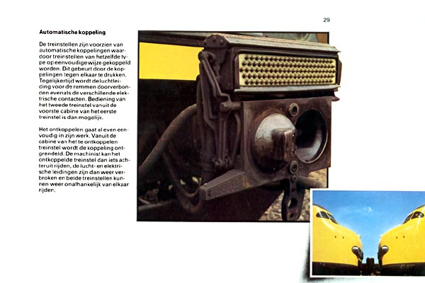 Amersfoort, 8 augustus 1977. Hondekoppenkoppeling. Tot en met deze treinstellen (materieel '54) konden alle elektrische stroomlijntreinstellen in combinatie met elkaar rijden. Van dit principe is met de komst van de treinstellen plan T en V (materieel '64) afgestapt. |