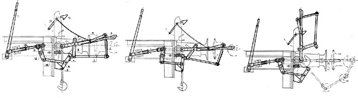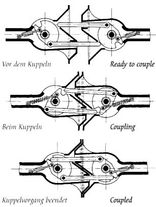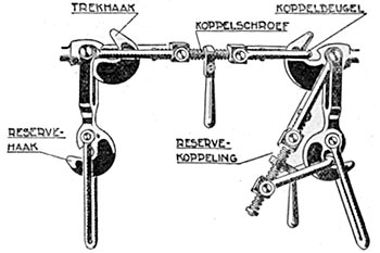 De oorspronkelijke koppeling van de DE3, type Unirop. De koppeling is aangebracht aan een ongeveer 6 meter lange balk. Tekeningen uit het boek "Vóór de seinen veilig gaan" van A.P. Berkhoudt (1942). |