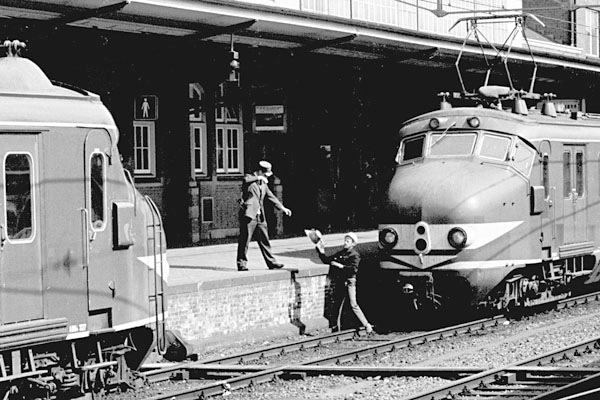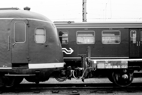 Amersfoort, 31 maart 1973. Het koppelen van treinstellen 327 (met trappetjes op de neus) en 383. De rangeerder overhandigt de bh aan de conducteur, die deze afdekplaat in de cabine van het treinstel zal opbergen. Tegenwoordig rijden treinstellen heel vaak topless rond. Dat scheelt vast veel moeite voor het rangeerpersoneel, maar echt goed voor de koppelingen lijkt het me niet. |