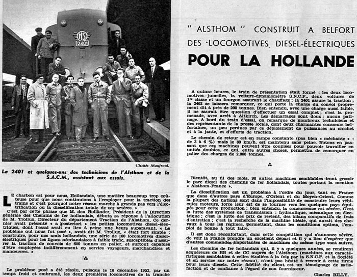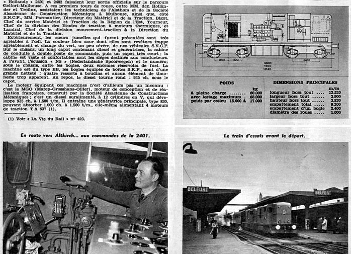 La Vie du Rail 432, 1954Artikel over een proefrit met locs 2401 en 2402 op 16 december 1953 tussen Belfort en Mulhouse. De locs zijn gebouwd door Alsthom (de h is later uit de naam verdwenen). Belfort ligt hier. |