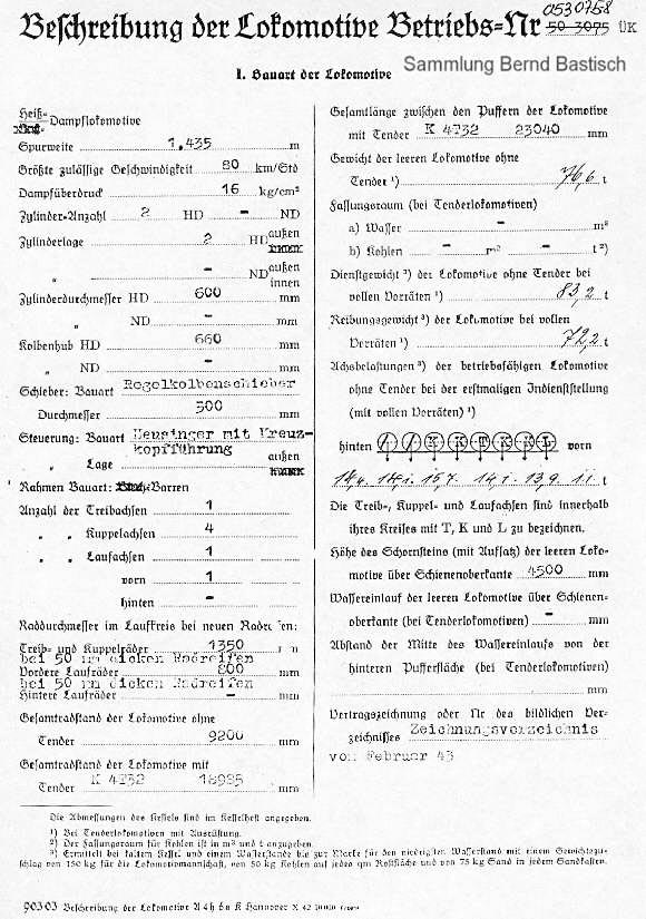Beschrijving uit februari 1943 van loc 50 3075 (later 053 075-8). Verzameling Bernd Bastisch. |