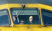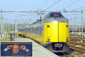| Sommige machinisten doen alles om maar op deze site terecht te komen! Zoals Dolf Dijkstra, die altijd een speciaal gebaar maakt als zijn trein wordt gefotografeerd. De eerste foto is gemaakt door Dennis Revier in Hoofddorp, op 6 februari 2005. De tweede foto is gemaakt door Johannes Hanno v/d Heijden in Amersfoort, op 23 april 2005. Even later kwam ik Dolf op het perron tegen en kon ik hem vertellen dat hij voor de tweede keer was betrapt door een van mijn correspondenten! |