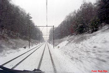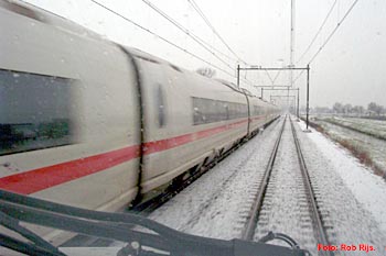 | Mark Rijs stuurde mij deze foto's die door zijn vader Rob Rijs zijn gemaakt. De bovenste twee foto's heeft Rob als ICE-machinist gemaakt op 18 april 2003, op de Neubaustrecke in Duitsland. In het midden twee foto's in een besneeuwd Nederland, op 23 december 2003, eveneens vanuit de cabine van een ICE. De onderste twee foto's zijn gemaakt op 22 februari 2003. Links een defecte ICE die door een Thalys van Haarlem naar de Watergraafsmeer werd gesleept. Rechts een ICE die in de Schipholtunnel voor een rood sein moest wachten. |