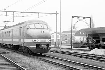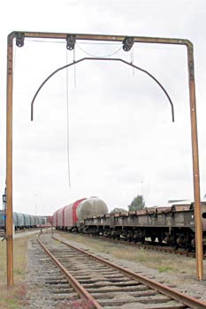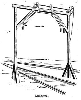 Ladingmallen werden gebruikt om te meten of de lading van een goederenwagen niet buiten het profiel van vrije ruimte stak. Omdat er in Europa verschillende profielen bestaan, kon de ladingmal in verschillende posities worden ingesteld. Foto's: Amersfoort, 9 maart 1974 en 11 september 2004. Ladingmal op het goederenemplacement. In 2004 was een van de meetprofielen verdwenen. |