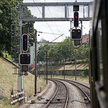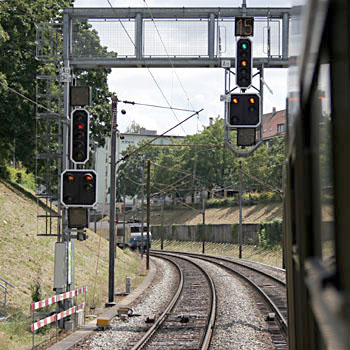 Basel, 12 juli 2007. De trein uit Mulhouse nadert het station Basel. Op de linkerfoto staat de trein stil voor een rood sein. Op de rechterfoto krijgt de trein toestemming om (langzaam) door te rijden. De vierkante seinen zijn voorseinen. Deze geven beide aan dat het volgende hoofdsein op onveilig staat. Merk op dat de Franse treinen rechts rijden, zoals dat in deze voorheen Duitse regio gebruikelijk is, terwijl de Zwitserse seinen links zijn geplaatst. Tussen en naast de rails zijn de magneetspoelen zichtbaar van het Integra-Signum beveiligingssysteem. Boven het rechtersein bevindt zich een lichtbak. Het getal 15 betekent dat op de bovenleiding 15.000 volt 16,7 Hz staat, het in Zwitserland gebruikte systeem. De bovenleiding kan ook op 25.000 volt 50 Hz worden geschakeld, voor Franse treinen die op het Franse deel van het Baselse station binnenkomen. In dat geval verschijnt het getal 25 in de lichtbak. |
