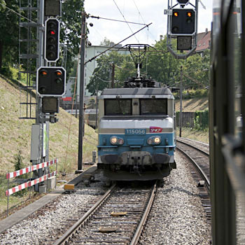 Basel, 12 juli 2007. SNCF-loc 115056 op weg met een trein naar Mulhouse. Even later ontmoeten we elektrische rangeerloc 16514 van de SBB. Het dwergseintje geeft aan dat onze trein mag doorrijden (twee horizontale witte lampen betekenen stop, twee diagonale lampen betekenen reken op stop.). |