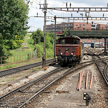 Grensovergang Mulhouse-BaselBij Basel ontmoeten twee bovenleidingsystemen elkaar. Dit is opgelost met een omschakelbare bovenleiding. Het rangeerwerk wordt gedaan met elektrische rangeerlocs die voor beide systemen geschikt zijn. |