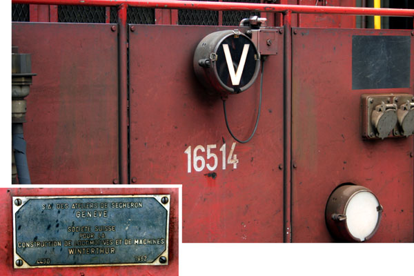 Loc 16514 is gebouwd in 1962. Van dit type Ee 3/3 zijn de locs 16511 t/m 16519 geschikt voor 15.000 en 25.000 volt. Ook kunnen ze in treinschakeling met elkaar rijden, zie de stuurstroomkabels en contacten op de neus. De drieassige locs worden via een "Blindwelle" (blinde as) aangedreven. |