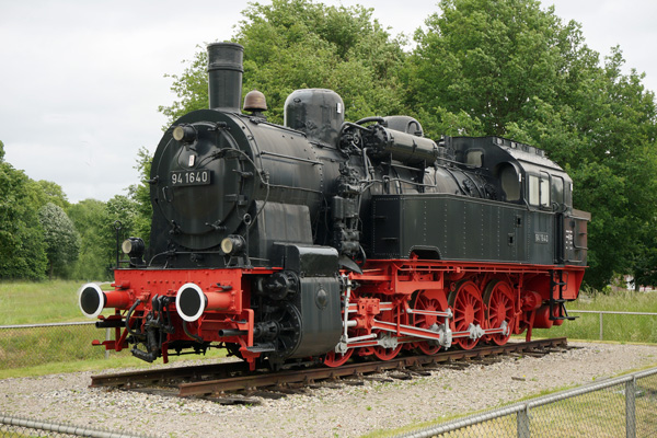 Gennep, 2 juni 2015. Loc 94 1640 als monument ter herinnering aan de Noord-Brabantsch Duitsche Spoorwegmaatschappij, die in Gennep een groot emplacement had. Hier is nu niets meer van terug te vinden. De fraaie locs van de NBDS, de Blauwe Brabanders, zijn allemaal gesloopt. De Pruisische T16' die nu in Gennep staat heeft niets met de NBDS te maken. (De VSM heeft ook een 94'er gehad, maar die hebben ze aan een sloper verkocht toen de loc defect raakte. Jammer; er was in Beekbergen best een leuk hoekje voor te vinden geweest.) |