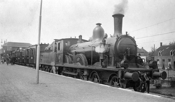 Stoomloc 1645 in Boxtel, met een trein richting Gennep. De foto zal tijdens de oorlog zijn gemaakt (zie de verduisterde frontseinen). Loc 1645 is in 1947 uit dienst gegaan. De spoorlijn van Boxtel via Gennep naar Wesel - het Duits Lijntje of Boxteler Bahn - is na de oorlog in fasen buiten gebruik gegaan en uiteindelijk afgebroken. Fotograaf onbekend, collectie Nico Spilt. |