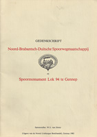 Gedenkschrift. Noord-Brabantsch-Duitsche Spoorwegmaatschappij en Spoormonument Lok 94 te Gennep. Samensteller W.S. van Dinter. Uitgave van de Noord Limburgse Boekhandel, Gennep 1982. Brochure uitgegeven ter gelegenheid van de officiële presentatie van 'Lok 94' als monument in Gennep. Het eerste deel bestaat uit een geschiedschrijving van de NBDS, tot aan het opbreken van de laatste restanten, waaronder in 1973 de spoorbrug over de Maas. In het tweede deel een verslag van de verwerving van loc 094 630* van de DB, het transport naar Gennep en de ingrijpende restauratie die daarop volgde. Achter in de brochure staat abusievelijk 094 530. |