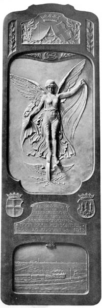 Huldeblijk van het personeel van de NCSM, in 1913 aangeboden aan de directie. Volgens het Jaarverslag van de NCS over 1913 is de maatschappij "door haar personeel gehuldigd door de aanbieding van een geschenk in de vorm van een artistiek uitgevoerde gedenkplaat, welke een plaats vond in de gang van het hoofdkantoor der Maatschappij." Dat hoofdkantoor bevond zich destijds in het dubbele pand Catharijnesingel 69/70. In 1919 verhuisde het kantoor van de NCS naar een van de Administratiegebouwen aan het Moreelsepark; het oude pand werd in dat zelfde jaar vernummerd in Catharijnesingel 51/52 en werd begin jaren 70 afgebroken ten behoeve van Hoog Catharijne. Dit object bevindt zich nu in de collectie van het Spoorwegmuseum. De bronzen figuur is de Nike van Päonios, als symbool van de snelheid, staande op een vliegend wiel. Verder zien we twee elkaar passerende treinen bij Blauwkapel, en de wapens van Utrecht, Amersfoort, Zwolle en Kampen. Vervaardigd door de Stichtsche Fabriek van Zilverwerken (Begeer) uit Utrecht, geadviseerd door prof. Vogelsang uit Utrecht. Het is ongeveer twee meter hoog. Aan het huldeblijk hebben 1184 personeelsleden en 77 gepensioneerden meebetaald (lang niet iedereen van het personeel had er behoefte aan om mee te doen). Omgekeerd zegde de directie toe dat alle personeelsleden een gratificatie zouden krijgen. Dat zou enkele maanden later gebeuren, tegelijk met het jubileum dat zustermaatschappij SS dan zou vieren. |