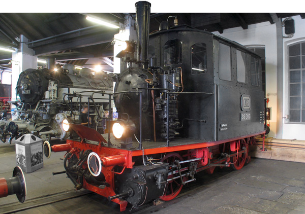 Neuenmarkt-Wirsberg, 17 augustus 2005. Dicht op elkaar, en slecht te fotograferen, staan in een halfronde locloods bij het Deutsches Dampflokomotiv-Museum een dozijn historische stoomlocomotieven opgesteld. Op de voorgrond loc 98 307. Dit is een zogeheten "Glaskasten" (verkleinwoord: "Glaskastl"), een voor eenmansbediening geschikte Beierse lokaaltreinlocomotief uit het begin van de vorige eeuw, waarvan er bijna 50 zijn gebouwd. Een bijzonderheid is dat deze locs via een "Blindwelle" (blinde as) werden aangedreven, omdat er geen ruimte was voor lange drijfstangen. Twee locs zijn bewaard gebleven, waaronder 98 327 die men gedeeltelijk open heeft gesneden om de werking te laten zien. Deze loc is bij de brand op 17 oktober 2005 in Nürnberg zeer ernstig beschadigd. |