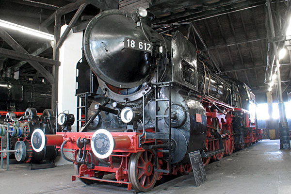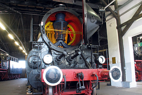 Neuenmarkt-Wirsberg, 17 augustus 2005. Loc 10 001 is een van de twee laatste sneltreinstoomlocomotieven die door de DB zijn gebouwd. Ze waren afgeleid van de serie 01.10: oliegestookte driecilinder-Pacifics met een gedeeltelijke stroomlijnbeplating. De twee door Krupp gebouwde locs kwamen in 1957 in dienst, te laat om nog een serieuze concurrent te vormen voor de oprukkende moderne tractievormen. Ze hebben nog geen tien jaar dienst gedaan. Loc 10 002 is gesloopt. Loc 10 001 is het pronkstuk van dit museum, maar was bij mijn bezoek op een nauwelijks te fotograferen manier opgesteld. Twee foto's met supergroothoek heb ik in de digitale doka aan elkaar gemonteerd. |