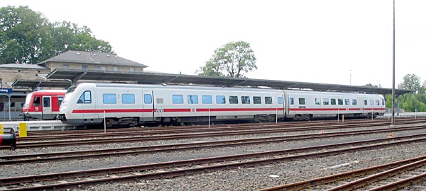 Neuenmarkt-Wirsberg, 17 augustus 2005. Treinstellen Baureihe 612, aangeduid als "RegioSwinger". Een deel is geschilderd in ICE-kleuren. Dit zijn dieselhydraulische treinstellen met een elektrisch kantelbakmechanisme, ontworpen door de Duitse industrie. Hiervan zijn er vanaf 1998 bijna 200 gebouwd, als vervolg op de Baureihe 611 waarmee men veel technische problemen heeft gehad. |