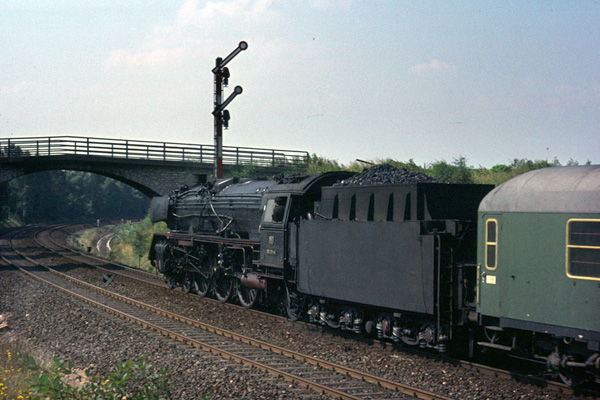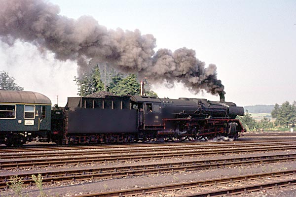 Neuenmarkt-Wirsberg, 3 september 1972. Loc 001 111 met een D-trein uit Hof. Het inrijsein staat op langzaam rijden. |